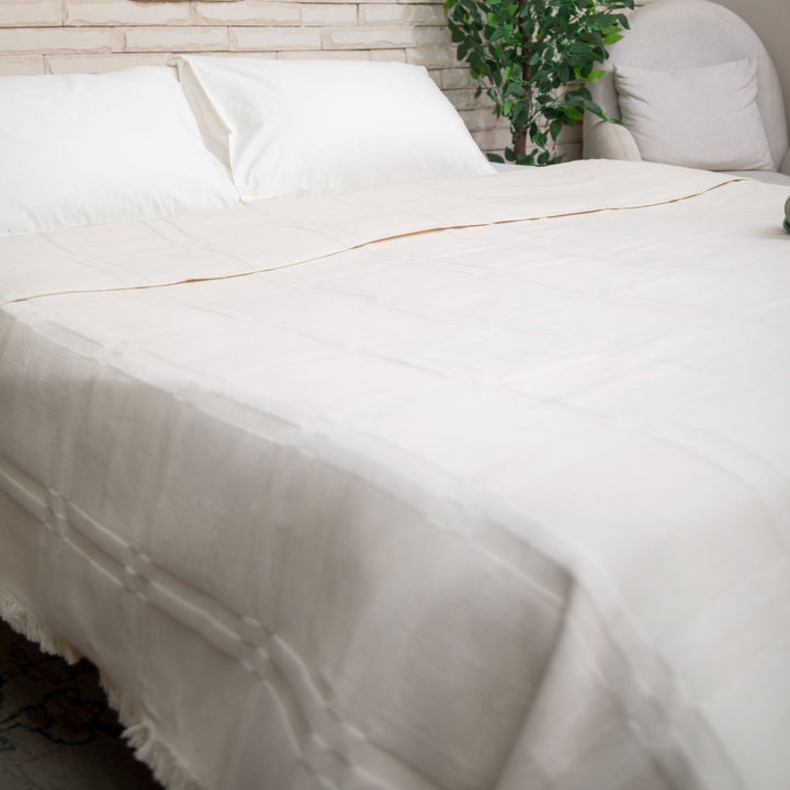صُنعت كوفرتة منسوج على الأنوال الخشبية بتقنيات متوارثة عبر العصور و بأنامل تنقل الدفء والحب و تمزجه،